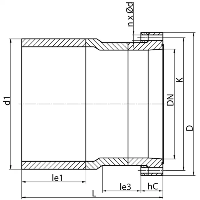 Art. No. | DN [mm] | d1 [mm] | D [mm] | le1 [mm] | le3 [mm] | L [mm] | K [mm] | n | ød [mm] | hC [mm] | kg |