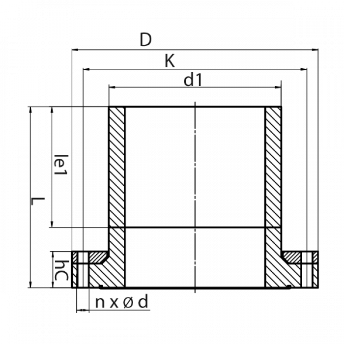 Art. No. | DN [mm] | d1 [mm] | D [mm] | le1 [mm] | L [mm] | K [mm] | n | ød [mm] | hC [mm] | kg |