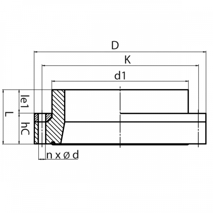 Art. Nr. | DN [mm] | d1 [mm] | D [mm] | le1 [mm] | L [mm] | K [mm] | n | ød [mm] | hC [mm] | kg |